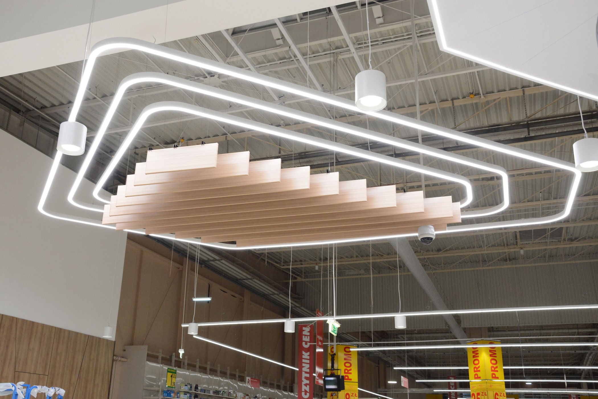 W 2018 roku mieliśmy przyjemność zrealizować wyjątkowy projekt oświetlenia dla sklepu Auchan w Żorach. Był to czas, gdy technologia opraw liniowych z zaokrąglonymi krawędziami i łagodnymi kątami dopiero się rozwijała, a jej zastosowanie stanowiło niemałe wyzwanie – zarówno pod względem technicznym, jak i projektowym.