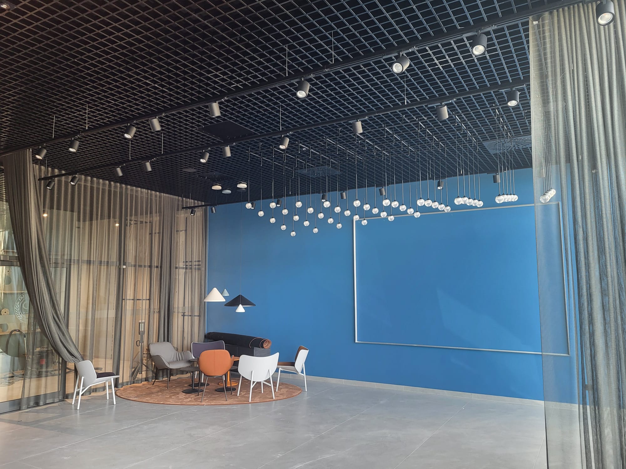 Wielkogabarytowej, podwieszanej oprawy o wymiarach 5 m × 3 m, zaprojektowanej i wykonanej na zamówienie specjalnie dla tej przestrzeni.