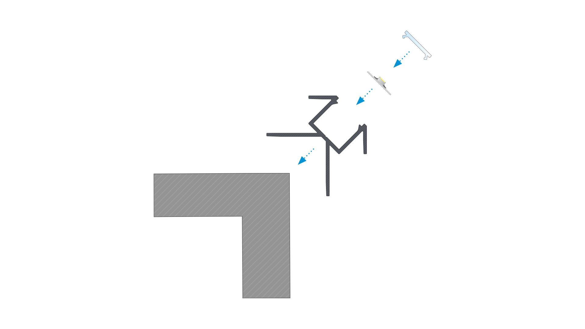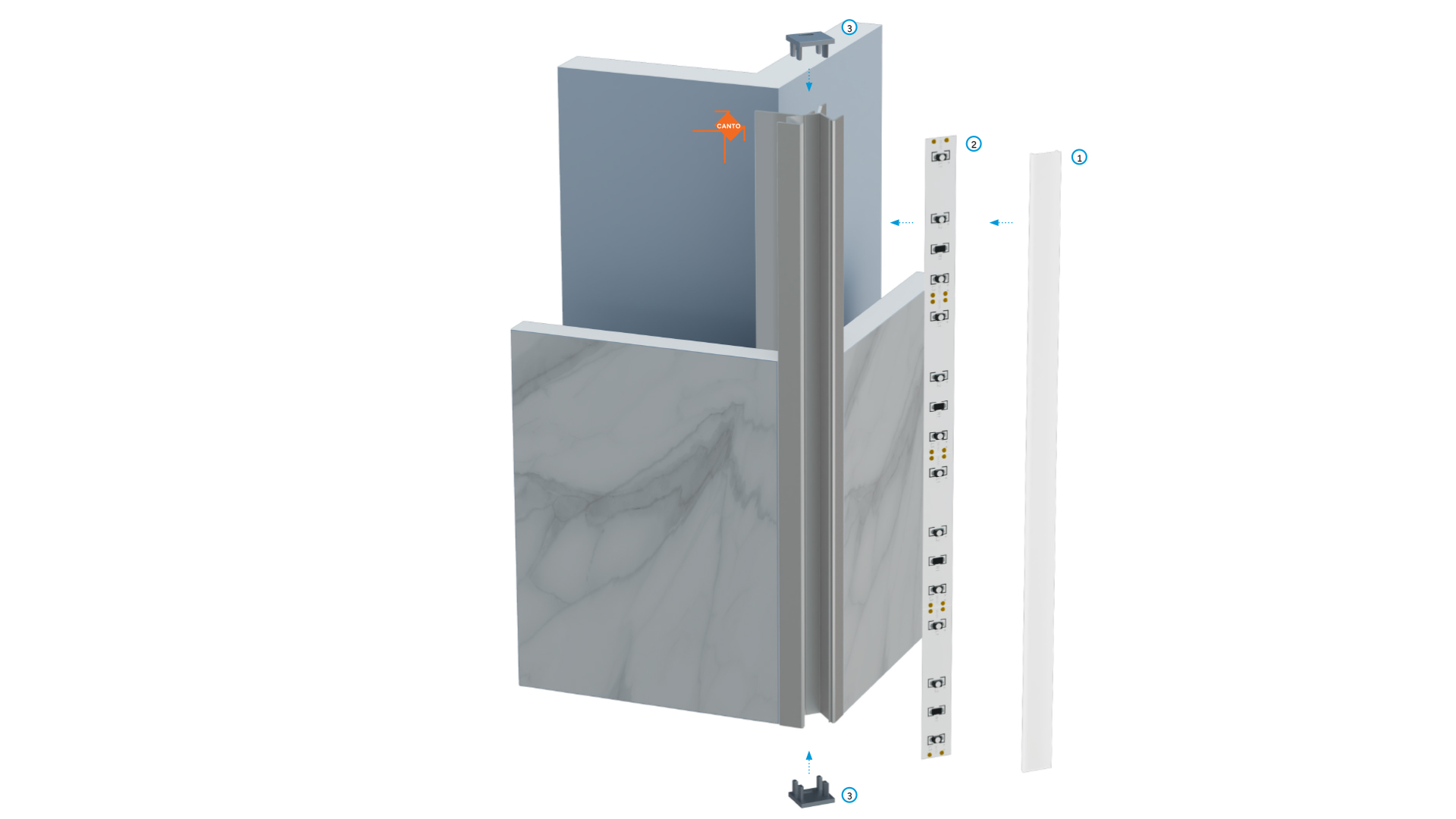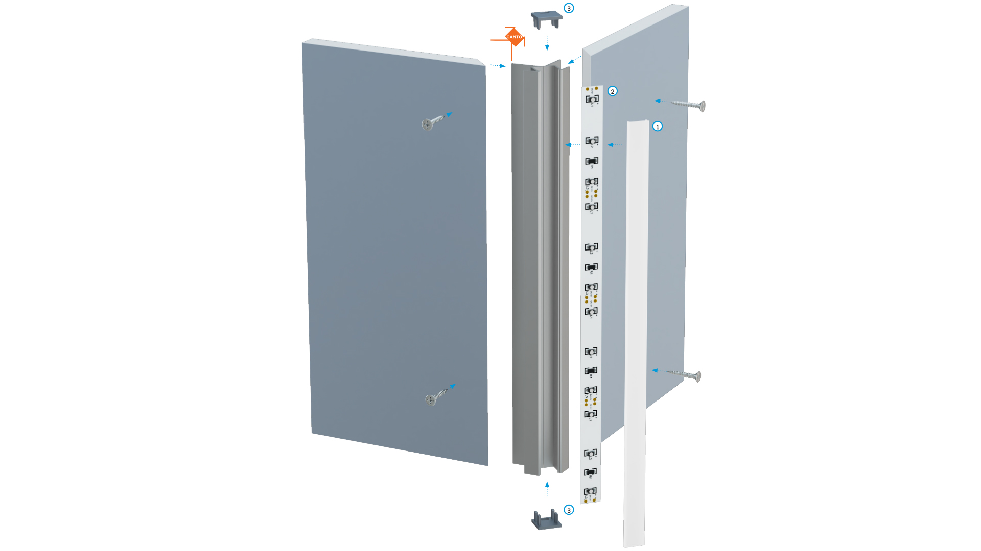 Schemat złożenia elementów systemu oświetleniowego z wykorzystaniem profilu CANTO oraz (1) klosza BASIC, (2) taśmy LED, (3) oraz zaślepek z otworem.