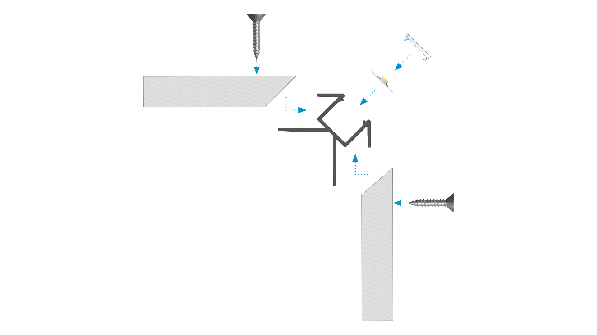 Schemat złożenia elementów systemu oświetleniowego z wykorzystaniem profilu CANTO oraz (1) klosza BASIC, (2) taśmy LED, (3) zaślepek z otworem oraz (4) wkrętów.