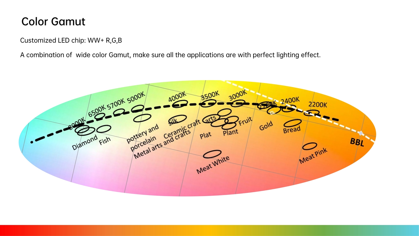 Wyposażona w diodę COB LED posiada cztery kanały (W+RGB). Teoretycznie może obejmować bardzo szeroką gamę barw, podobną do obszaru zakreślonego w białym trójkącie na zdjęciu. To zdjęcie pokazuje również współrzędną chromatyczności większości specjalnych diod LED i diod BBBL.