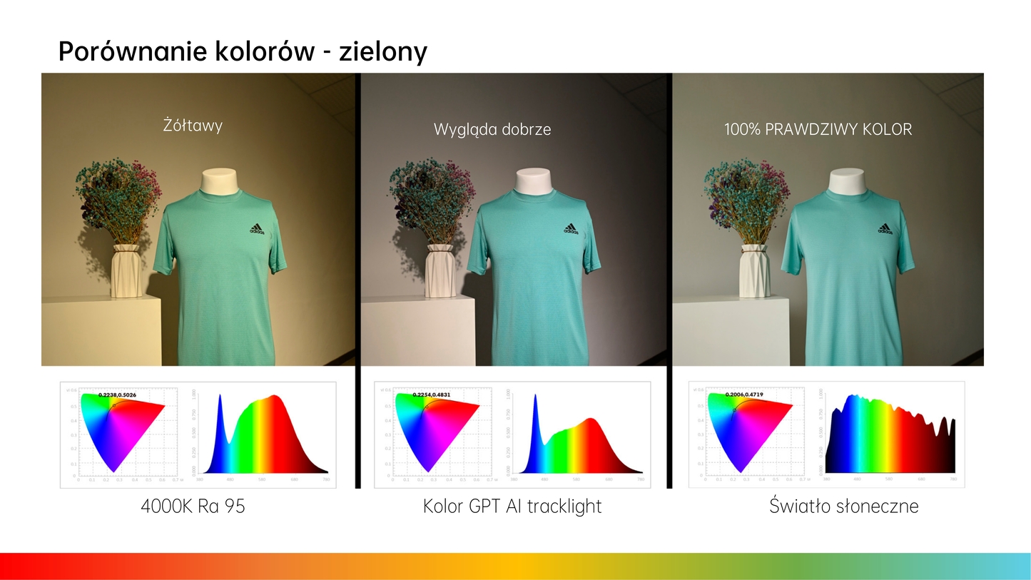 Reflektor Kolor GPT wykorzystuje technologię sztucznej inteligencji, która automatycznie dostosowuje parametry światła do konkretnego zastosowania – niezależnie od tego, czy chodzi o ekspozycję produktów, dzieł sztuki czy przestrzeni komercyjnych. To przełom w technologii LED, zapewniający zawsze optymalne, profesjonalne oświetlenie dopasowane do potrzeb otoczenia.