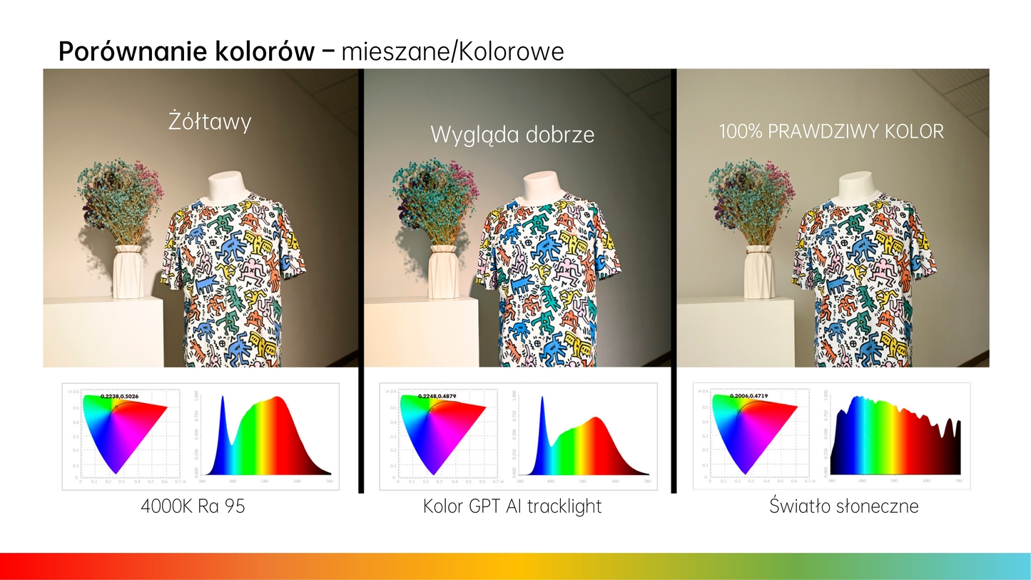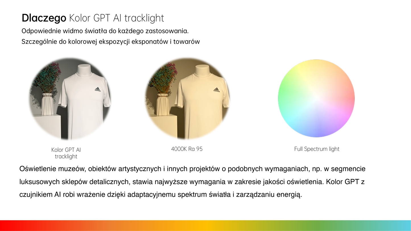 Reflektor Kolor GPT to zaawansowane rozwiązanie LED nowej generacji, wykorzystujące technologię sztucznej inteligencji. Został zaprojektowany z myślą o przestrzeniach ekspozycyjnych – muzeach, galeriach i butikach – w których liczy się perfekcyjna reprodukcja barw. Symulując pełne spektrum światła słonecznego, reflektor podkreśla autentyczność kolorów, oddając każdy detal w sposób naturalny i harmonijny.